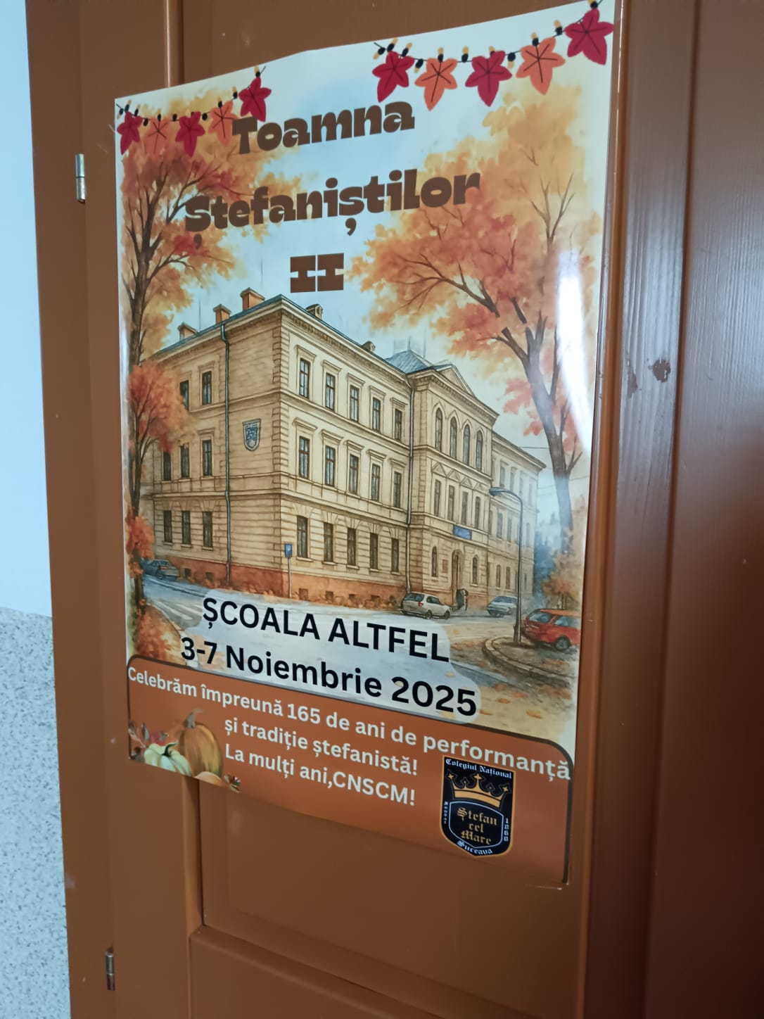În perioada 3–7 noiembrie 2025, Colegiul Național „Ștefan cel Mare” Suceava a găzduit, în cadrul programului „Școala Altfel”, ediția a II-a, proiectul educațional „Toamna Ștefaniștilor”, coordonat de doamna profesor Juravle-Lucescu Alina. Evenimentul a coincis cu aniversarea celor 165 de ani de existență ai colegiului, moment de sărbătoare și reflecție asupra tradiției și valorilor ștefaniste.